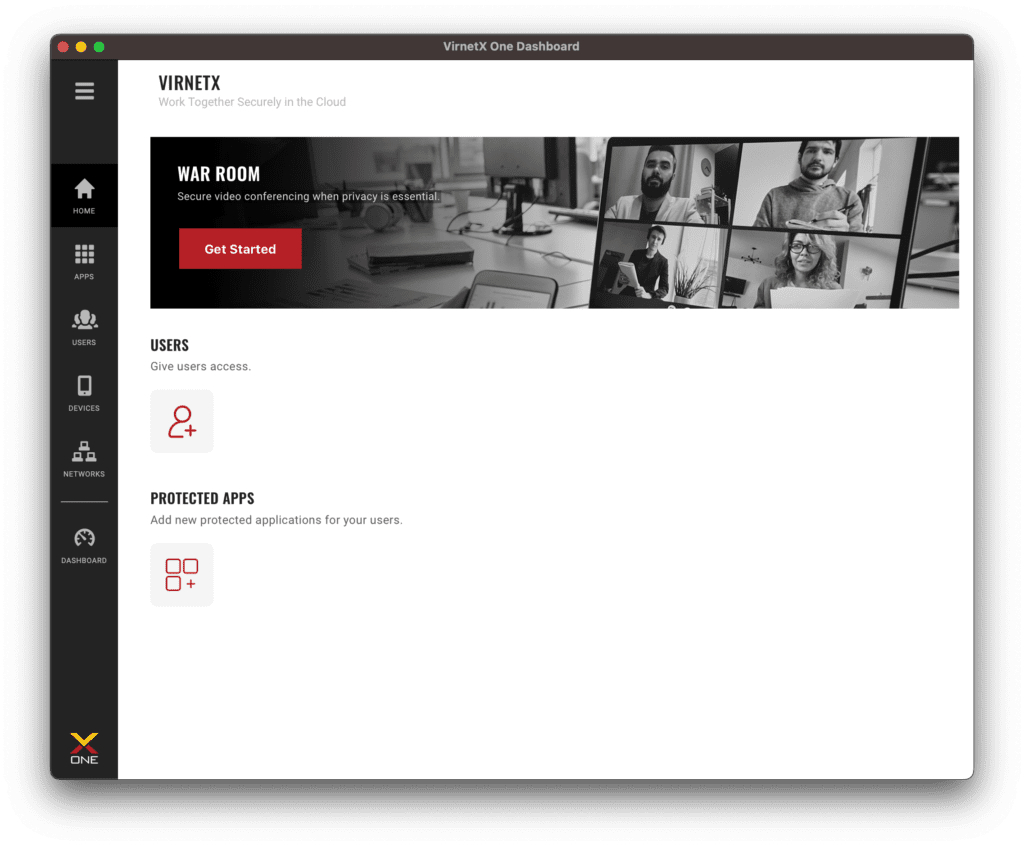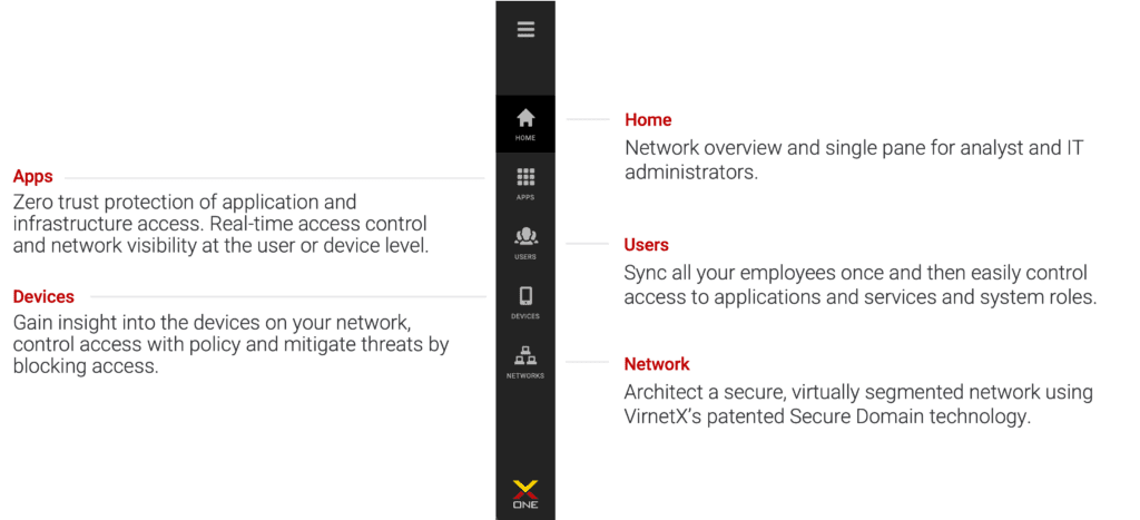 The VirnetX One Admin Console is a cloud-based administrative view of your network including visibility into applications, users, devices and networks. The Admin Console is accessible within the VirnetX One Client Dashboard for users with administrator, analyst or support roles.