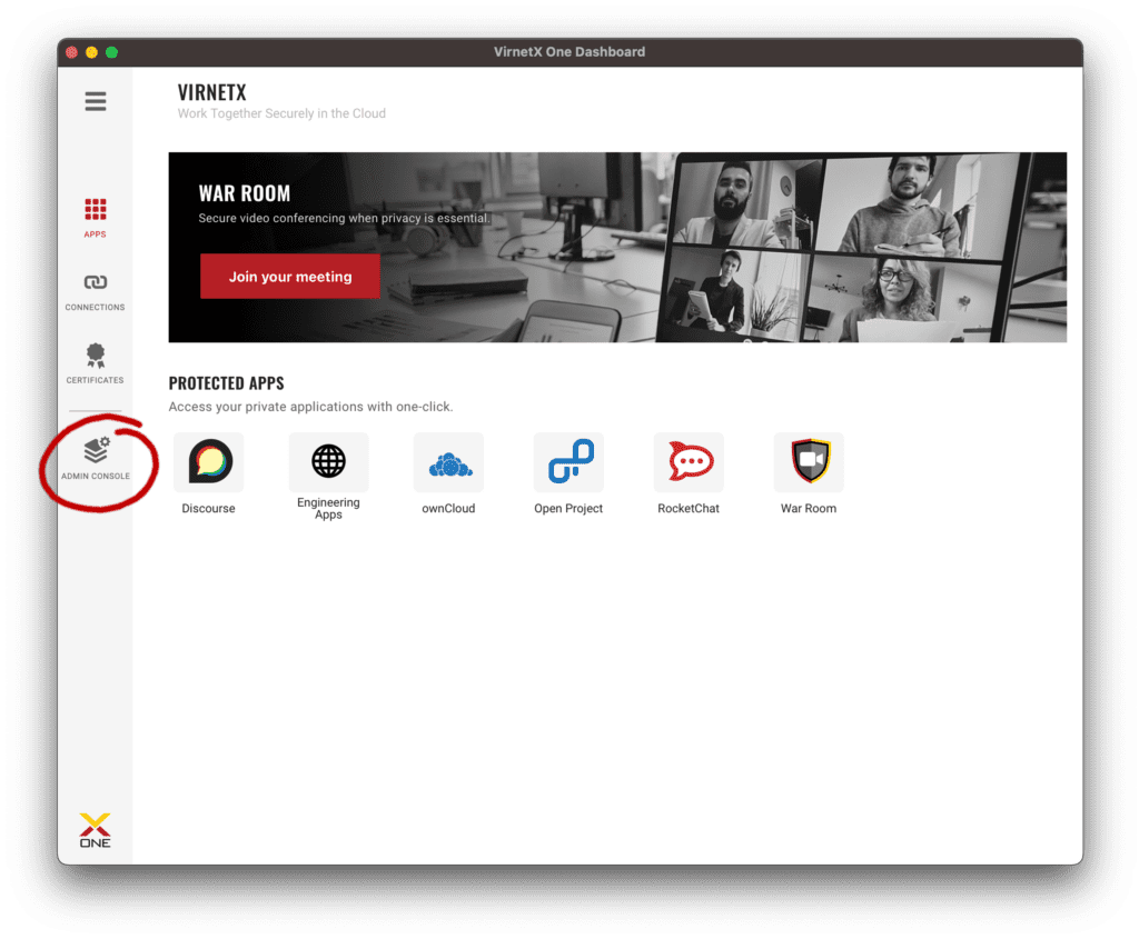The Admin Console is accessible from the VirnetX One Client Dashboard by clicking on the Admin Console icon at the bottom of the left sidebar menu. Only users with Administrator, Analyst or Support roles will have access to the Admin Console.