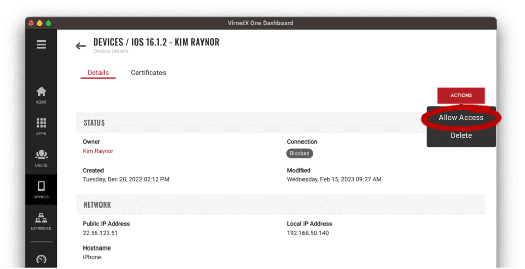 Alternatively, you can allow device access from the Device Details page and by clicking the Actions button, then Allow Access from the pop-up menu. The Connection status will change from Blocked to Offline.