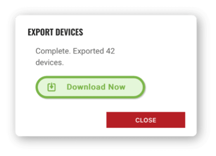 After processing, click the Download Now button in the dialog to download the CSV file of your device inventory. The file name will include a date and timestamp to make it easy identify when the file was processed. Click the Close button after you have downloaded the CSV file.