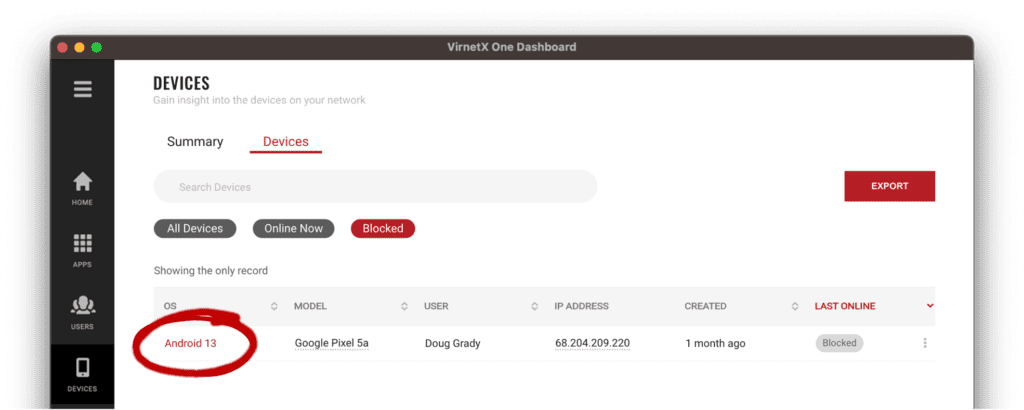 Device inventory is an important component of a Zero Trust Architecture to assess and monitor devices on your network. From the VirnetX One Admin Console, administrators can search, sort, and quickly filter devices based on device attributes, owner, online status, and blocked state. Access the device inventory by clicking Devices icon in the left sidebar menu and then click the Devices tab at the top. The default view shows all the devices in your inventory.