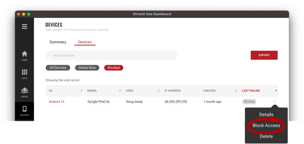 A blocked device is an authorized device that has been temporarily blocked by an administrator from accessing any application, services or infrastructure secured by VirnetX Matrix.