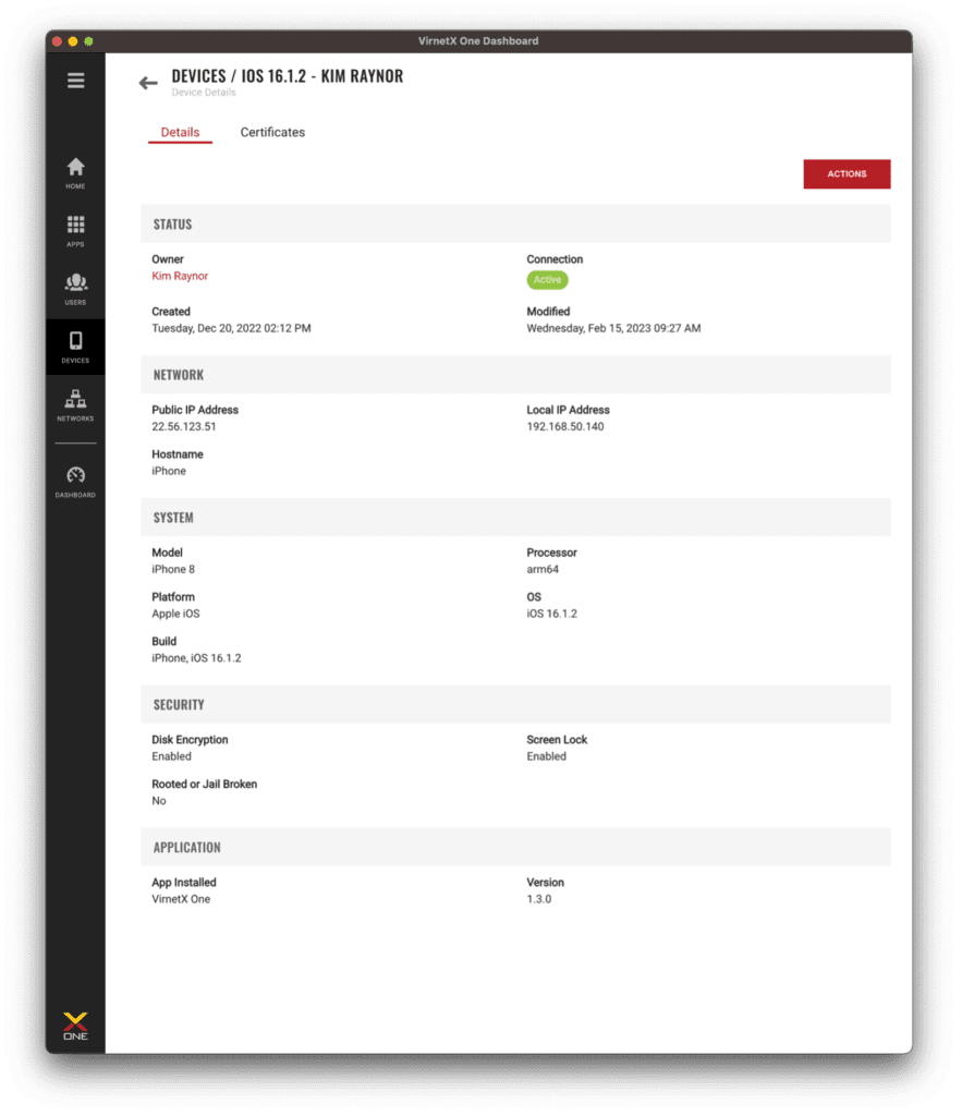 The VirnetX One client installed on each device, captures real-time, detailed information about all the authorized devices on your networks. This information includes device specific information, network information, security details, connection status and client application details. This information is updated in real-time when device system, security or network changes occur and can be used to make decisions on security posture and access. Based on these device insights, administrators can decide to temporarily block or permanently remove access for individual devices.