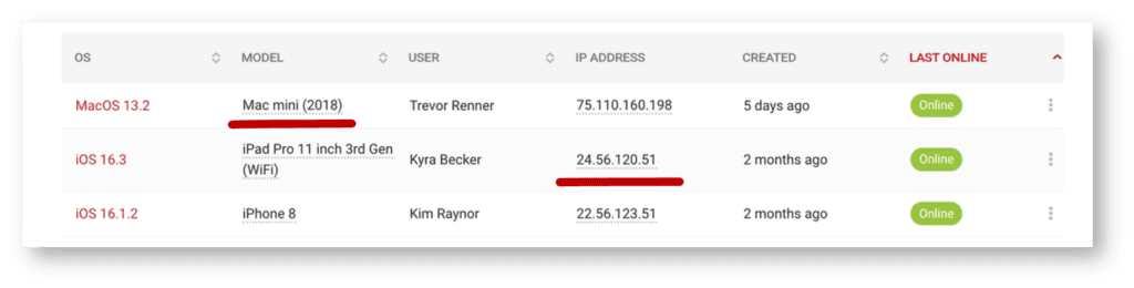 From the search box, you can quickly find devices based on operating system (e.g., Windows) or model (e.g., iPhone 11). Below the search box, is a set of filters you can click to refine your search based on all devices, online devices or blocked devices.