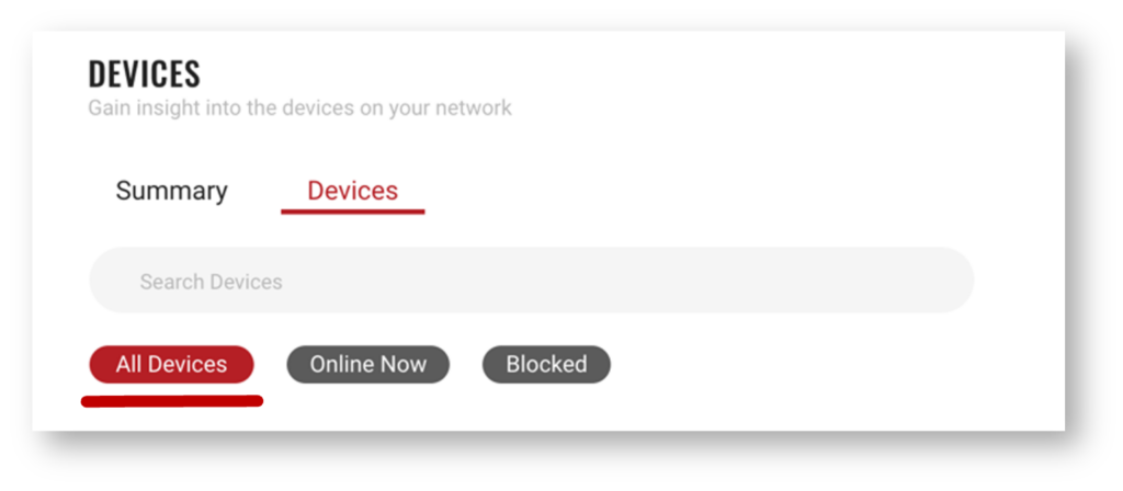 From the search box, you can quickly find devices based on operating system (e.g., Windows) or model (e.g., iPhone 11). Below the search box, is a set of filters you can click to refine your search based on all devices, online devices or blocked devices.