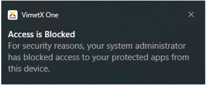A system notification is generated on the blocked device running the VirnetX One Mobile & Desktop client to notify the user that their access has been blocked for security reasons. All access to applications, servers and infrastructure secured by Matrix will be blocked immediately.