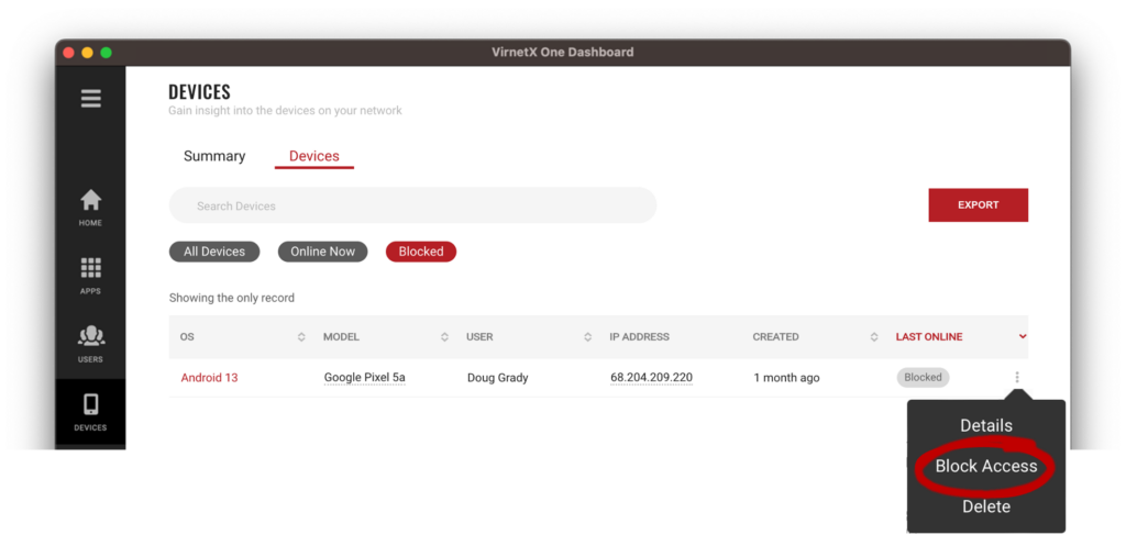 A blocked device is an authorized device that has been temporarily blocked by an administrator from accessing any application, services or infrastructure secured by VirnetX Matrix.