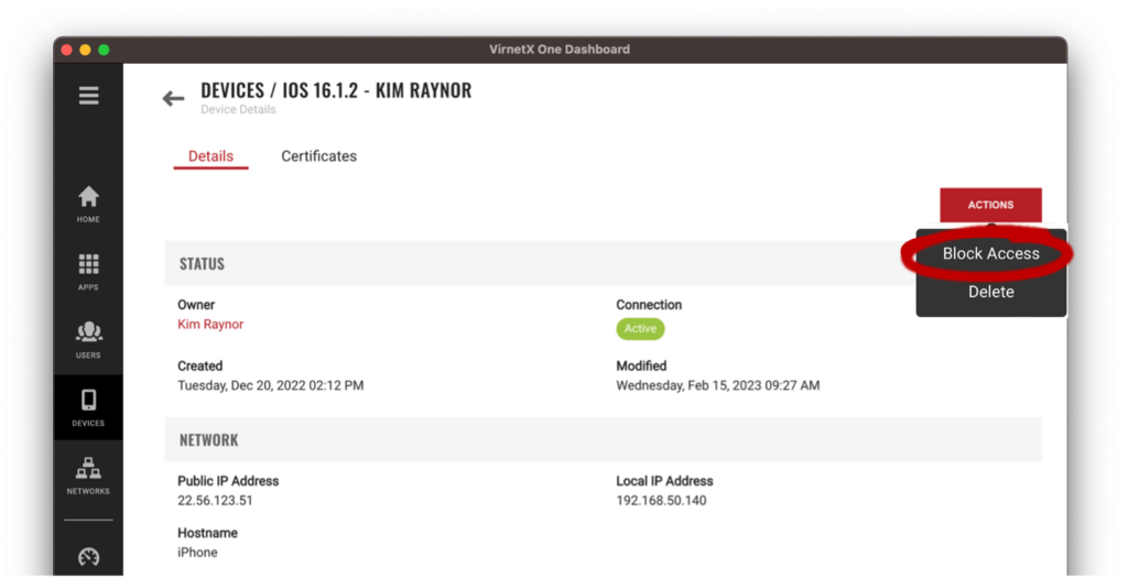 Alternatively, you can block device access from the Device Details page and click the Actions button, then Block Access from the pop-up menu.