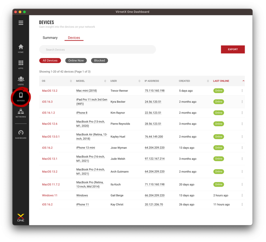 Device inventory is an important component of a Zero Trust Architecture to assess and monitor devices on your network. From the VirnetX One Admin Console, administrators can search, sort, and quickly filter devices based on device attributes, owner, online status, and blocked state. Access the device inventory by clicking Devices icon in the left sidebar menu and then click the Devices tab at the top. The default view shows all the devices in your inventory.