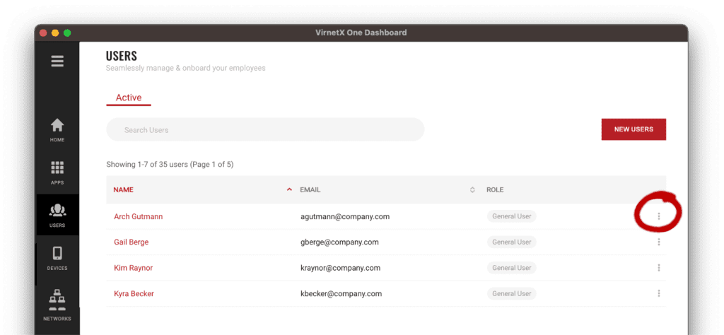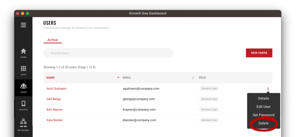 From the Users List, use the search to find the user you want to delete by searching for their name or email address. Next, click on the three-dot menu, and select Delete. Confirm that you want to permanently delete the user in dialog and then click the Delete button. The user will be deleted and all associated devices will have their application access revoked. The user will not be able to activate any new devices.