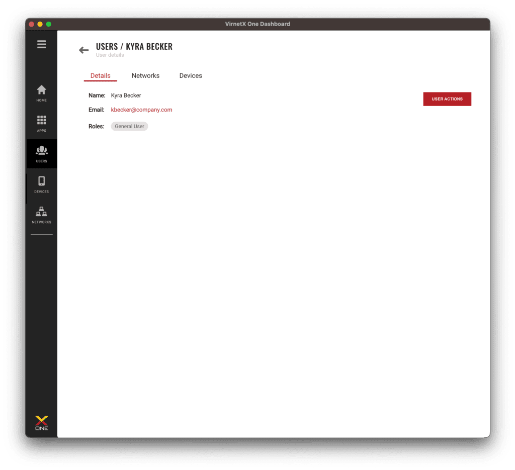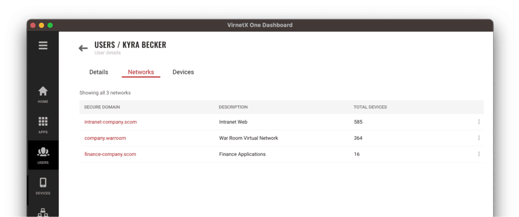The Networks tab on the users details page, tells which Secure Domain networks the user has access. This provides a quick visual of the networks and applications and how many devices that are granted access.