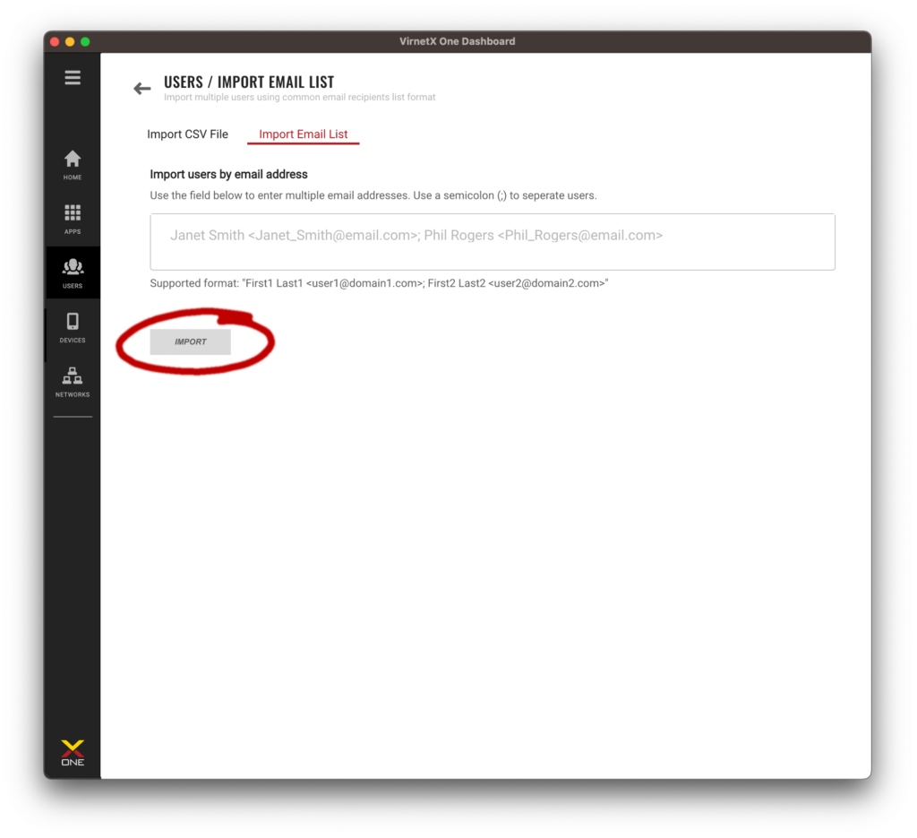 This allows you to easily copy users from an email or export users from other software in this format. The following example shows how to import multiple users by separating each user with a semicolon.