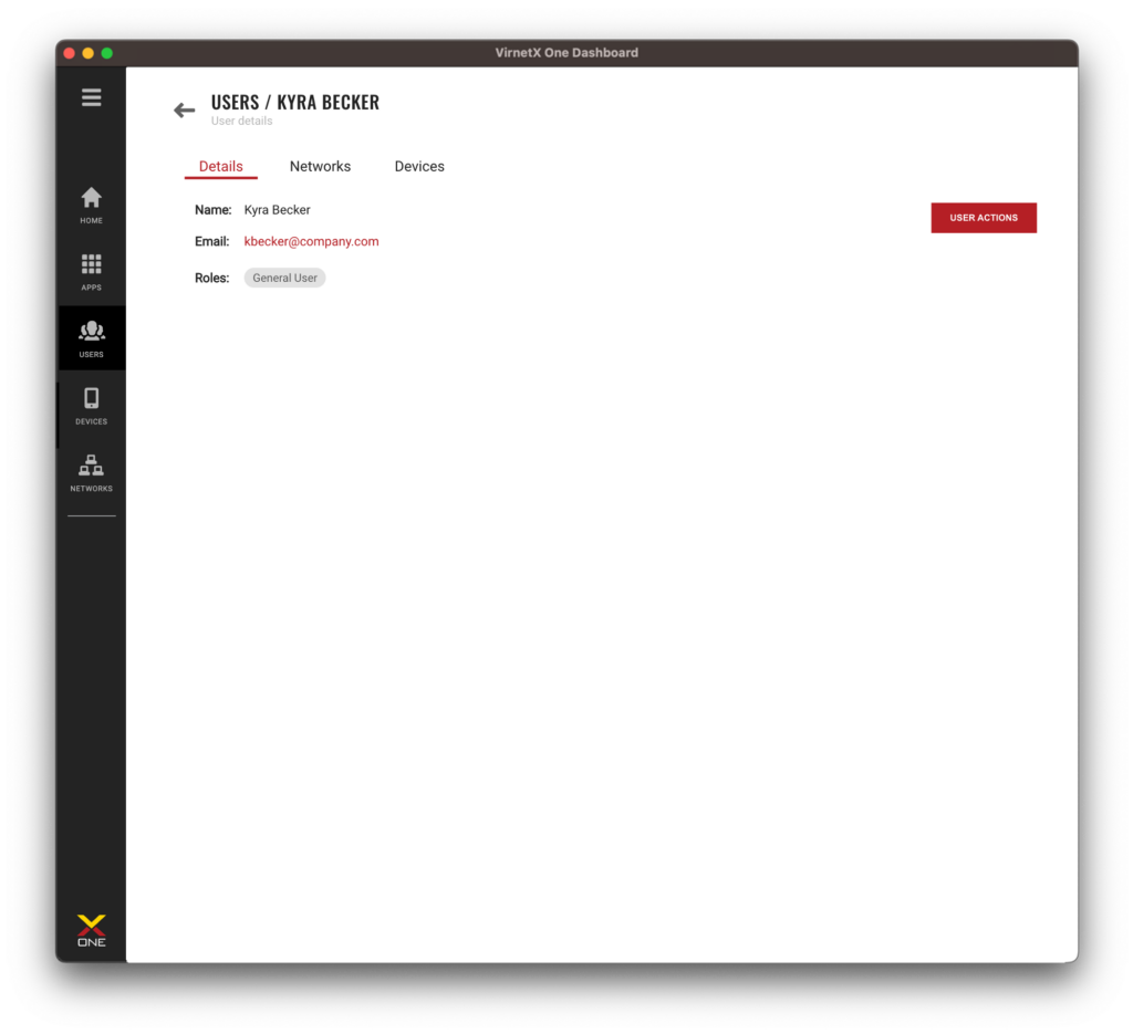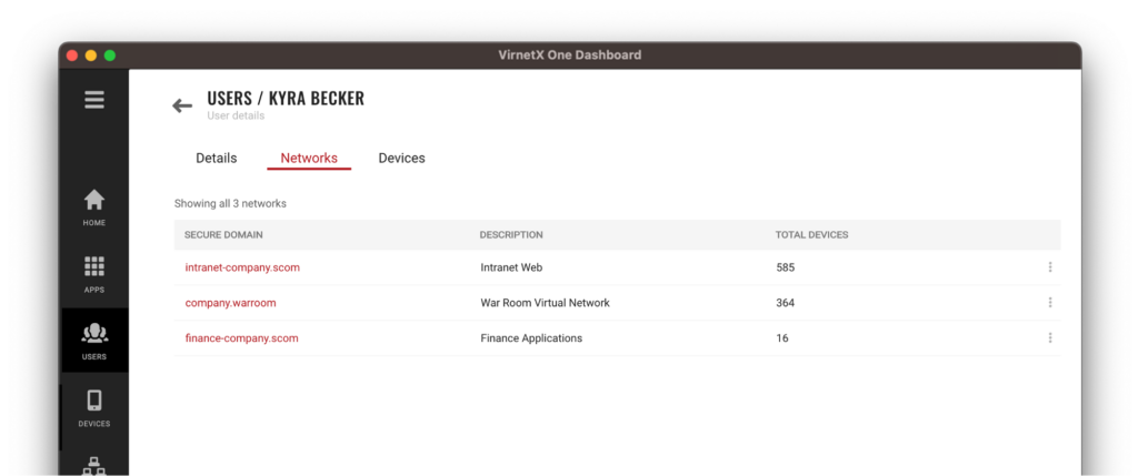 The Networks tab on the users details page, tells which Secure Domain networks the user has access. This provides a quick visual of the networks and applications and how many devices that are granted access.