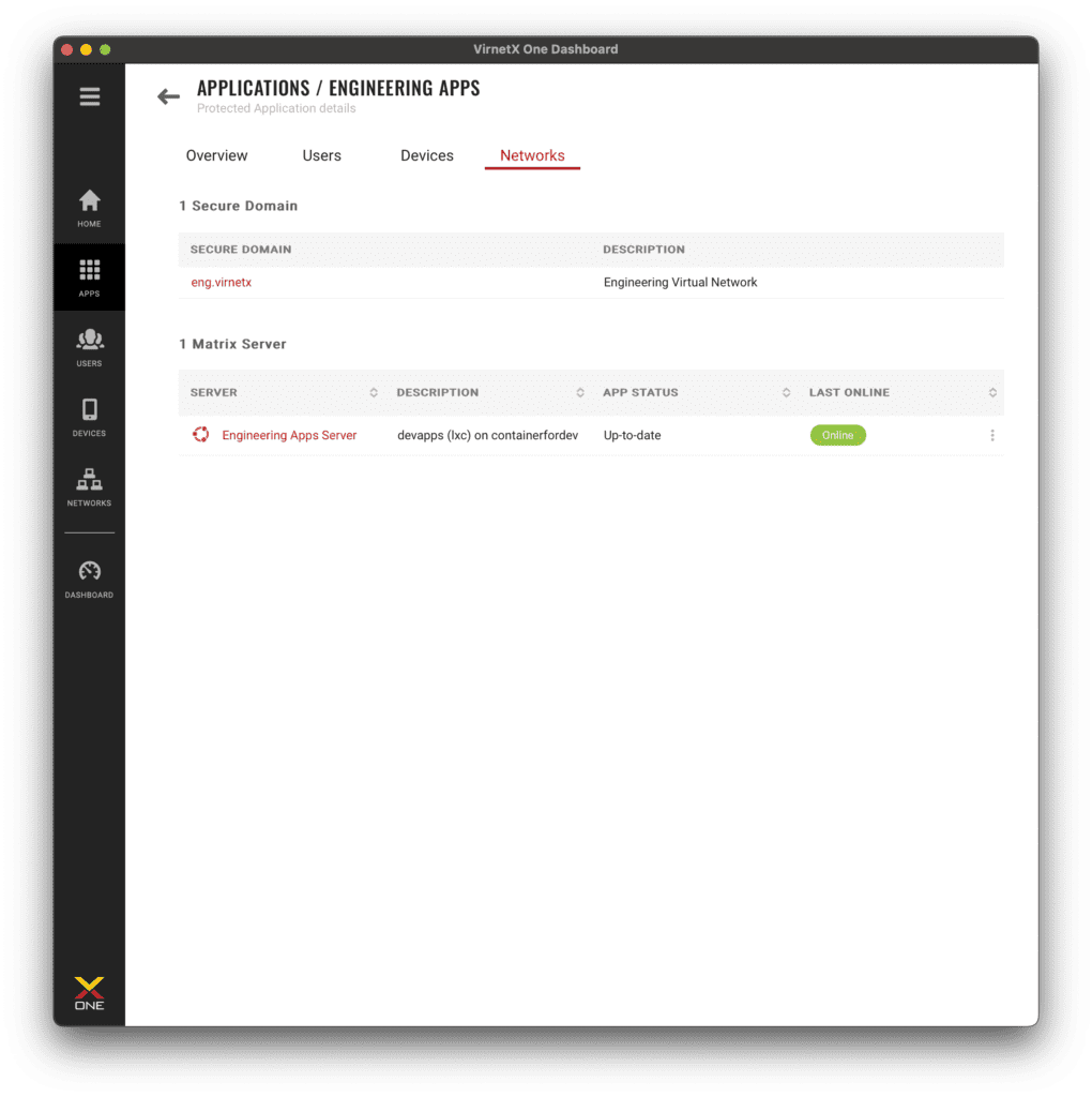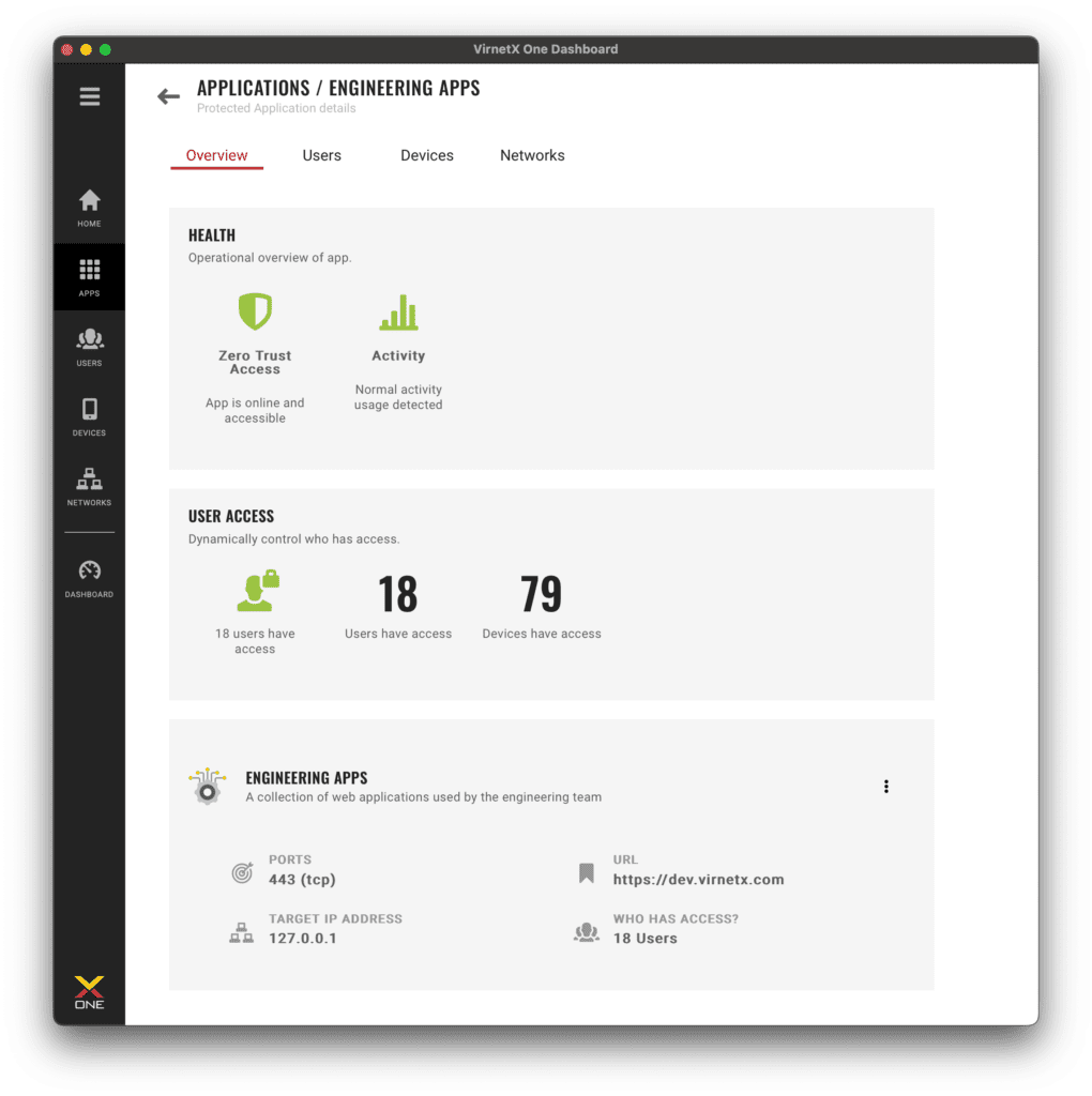 From the VirnetX Admin Console, the Apps page gives you a quick overview of all the applications, services, and infrastructure protected by VirnetX Matrix. You can protect a wide variety of self-hosted application types and protocols.