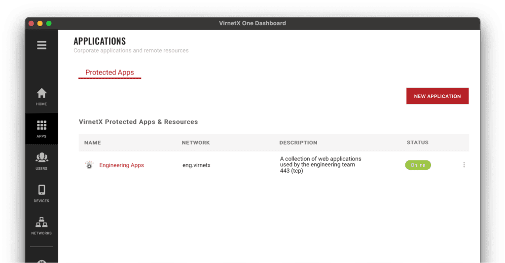 If you’re just getting started, click the New Application button to start protecting your application with VirnetX Matrix. Refer to the Protecting Your Applications Guide for more details.