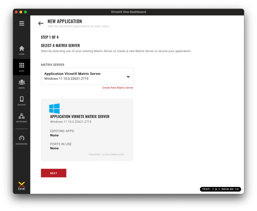 If you’re just getting started, you will need to first create a new VirnetX Matrix Server. You can create as many VirnetX Matrix Servers as you need to secure different applications.