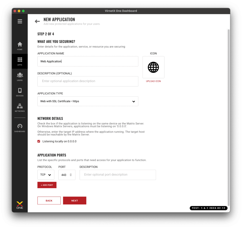 In this step, you will be entering the configuration details of the application, service, or resource you are securing with the VirnetX Matrix Server.