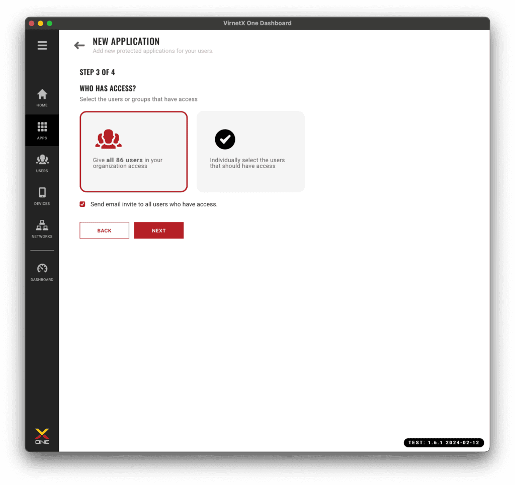 Next, choose whether you want an email invite sent to all users who have access. Once application setup is complete, all users given access will receive an email to let them know they’ve been added. The application will automatically appear on the VirnetX One Dashboard, and they will get access regardless of whether you choose to send them an email.