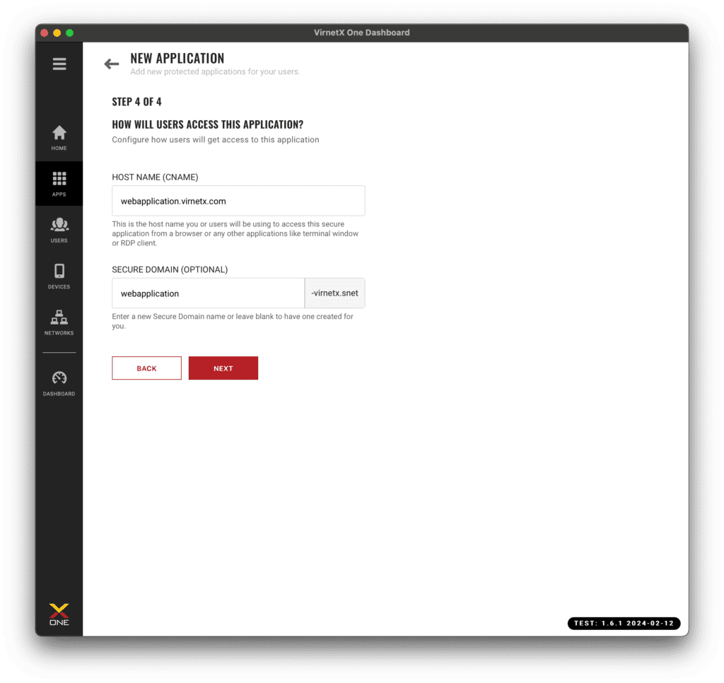 Each application is allocated a unique VirnetX Secure Domain. This is a virtual network where users are given access to connect to the application you are securing. By default, a unique secure domain name is selected, but you can change the domain name prior to the hyphen (e.g., custom-virnetx.snet).