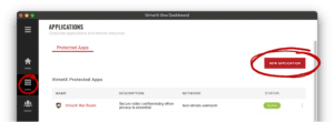 2. Click the APPS button to display the APPLICATIONS Screen. This view lists all the applications that are being secure by VirnetX One platform. In addition to VirnetX WarRoom you can secure any of your existing applications that run on TCP and/or UDP protocol. Click on ‘NEW APPLICATION’ and follow the instructions to add your application. For more information, please see ‘Securing an Application using VirnetX One Matrix’.