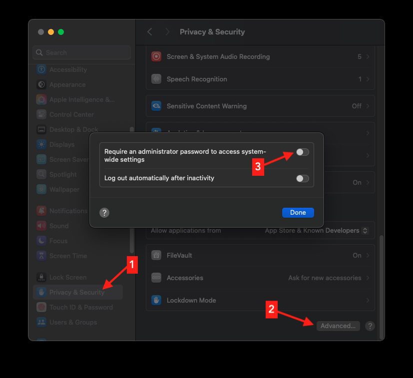 5. Toggle off the setting “Require an administrator password to access system-wide preferences.”